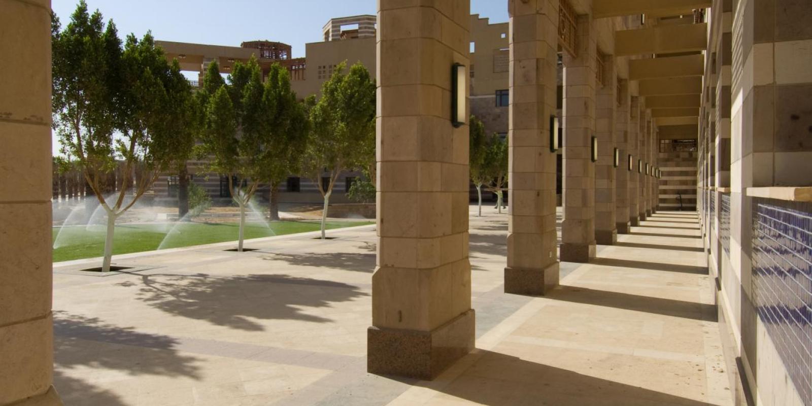 والعامل الآخر المهم للغاية في البيئة الصحراوية هو فكرة الساحة أو الفناء أو المساحة المطوقة. فقد استخدمنا المساحة المفتوحة كي تكون خاصية حيوية وإيجابية. وقد نفذنا ذلك من خلال فكرة المحور المركزي للحرم الجامعي الذي يتكون من ساحات وأماكن مترابطة معاً.