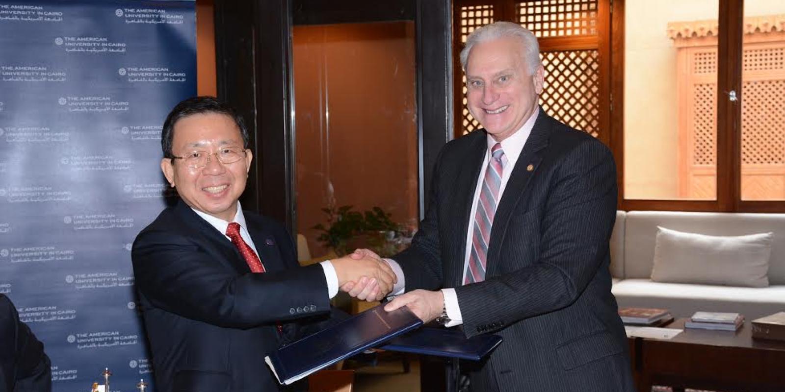 President Francis Ricciardone welcomed University of Seoul's President Yun-hi Won, accompanying senior staff and researchers, highlighting the commonalities between both institutions, with the University of Seoul celebrating its 100th anniversary this year, just one year before AUC celebrates its own centennial. “University of Seoul is a global university and has an active and advanced international partners program,” Ricciardone said. “What we’re doing today fits right in, precisely, with who we are and what we’re trying to do.”