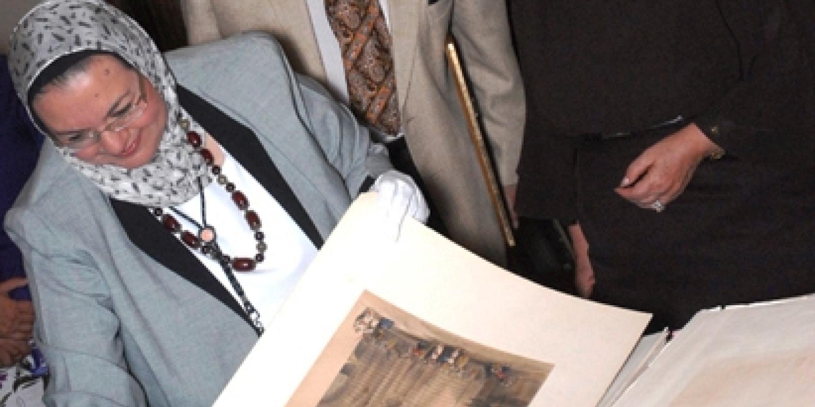 Photo caption: Daad Abdel Razik, assistant director at the Rare Books and Special Collections Library; Ali Saleh, husband of Nadia Niazi Mostafa; and Nadia Niazi Mostafa